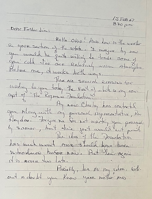 In 1967 Father James Reymann, Charles and Salome’s son, received a letter from one of his nephews who was actively serving in the Vietnam War. Gilbert Reymann, Jr., “Sonny” to his family, was writing to express his concept of “The Reymann Foundation”. Sonny had also been in contact with his cousin, Charles “Chuck” Reymann (who he affectionately called Charlsy). Both cousins felt that creation of the Foundation had much merit.