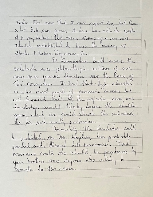 Briefly, here is my idea. Without a doubt you know your mother and father far more than I ever expect to, but from what bits and pieces I have been able to gather it is my belief that some form of a memorial should established to honor the memory of Charles and Selma Reymann, Sr.