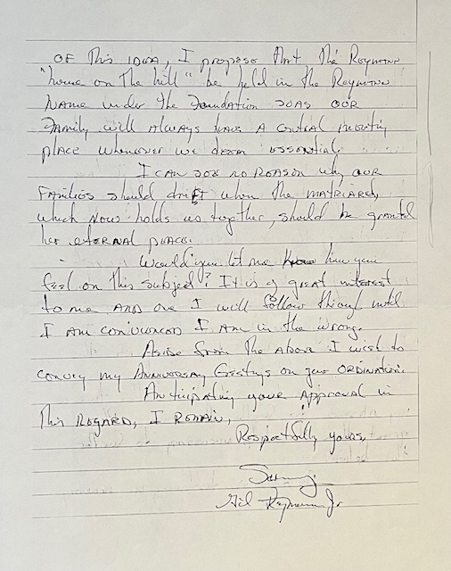 As a living testimony in memory of this idea, I propose that the Reymann “house on the hill” be held in the Reymann name under the foundation so as our family will always have a central priority place whenever we deem essential.