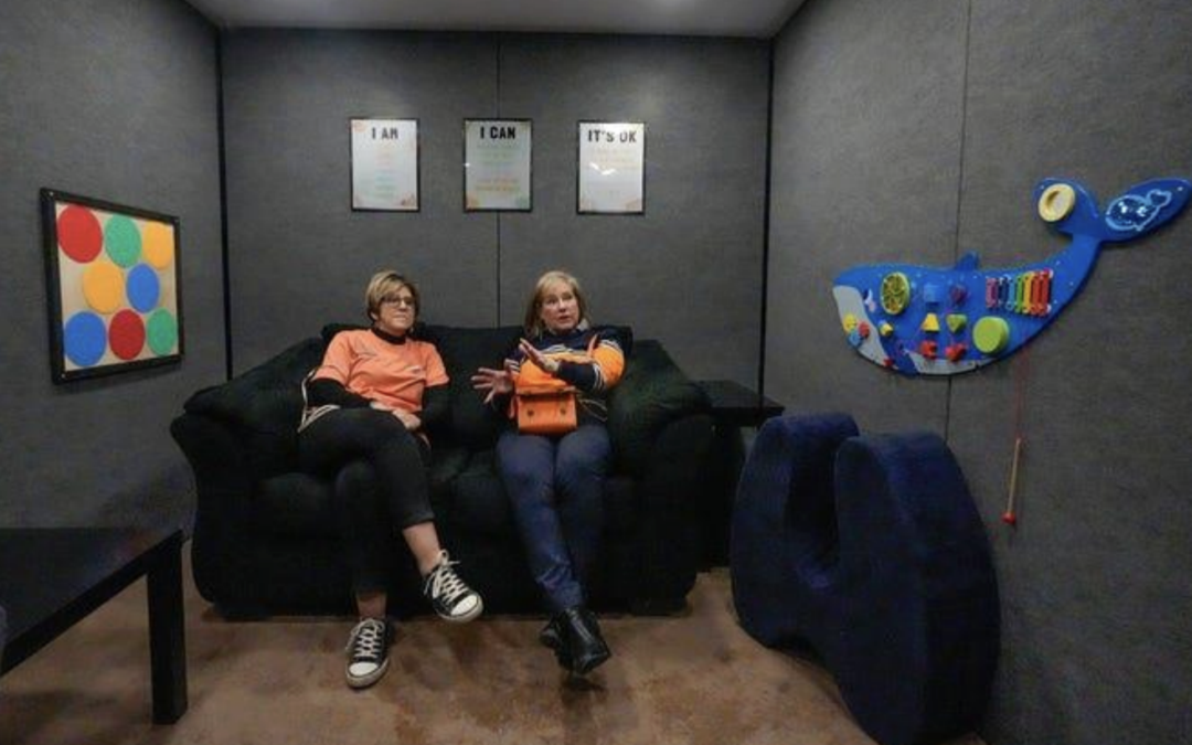 Sensory Explorers Comfort Station at Akron Zoo featuring tactile gear-shaped wall activities and blue cushioned seating.